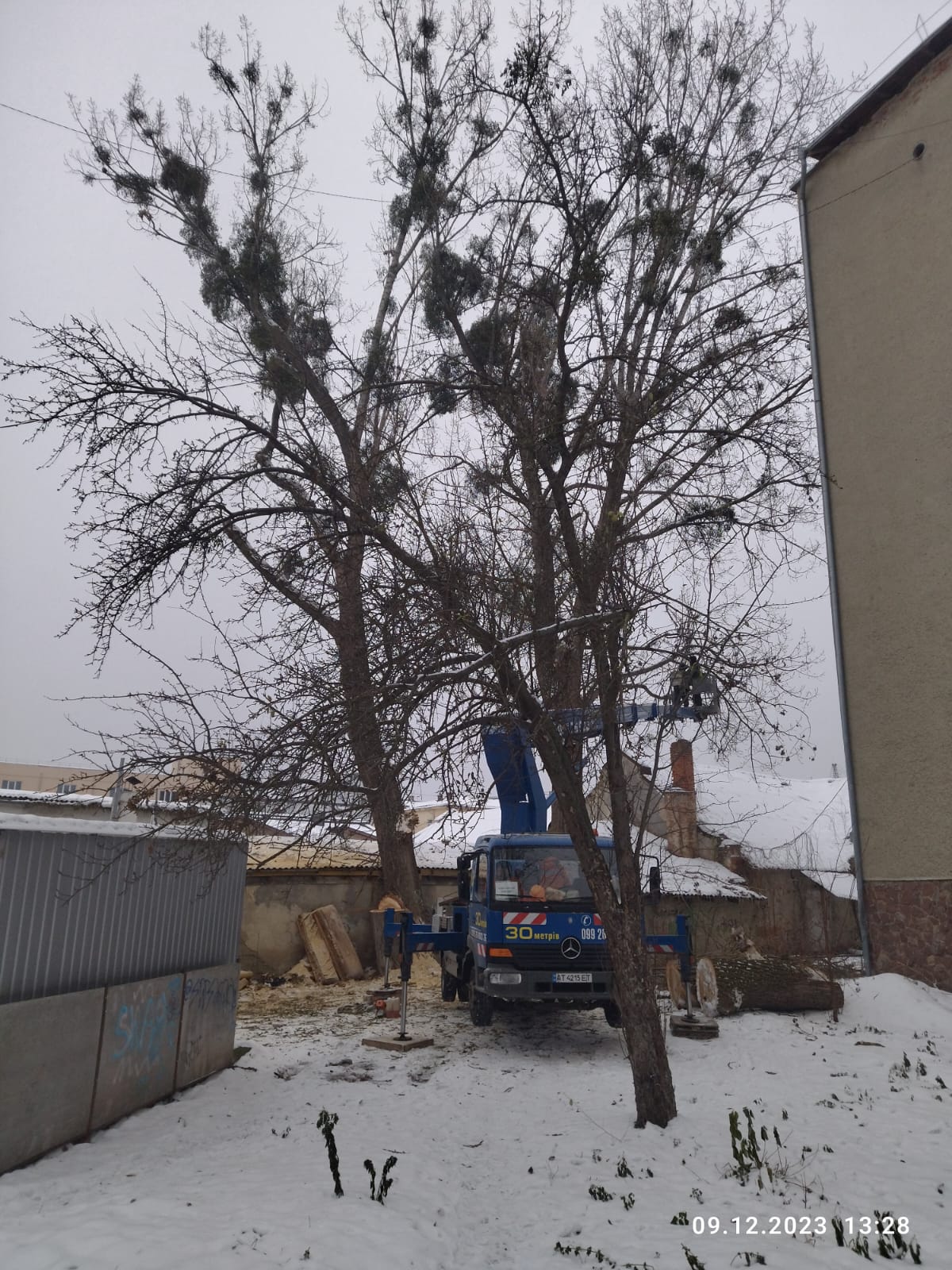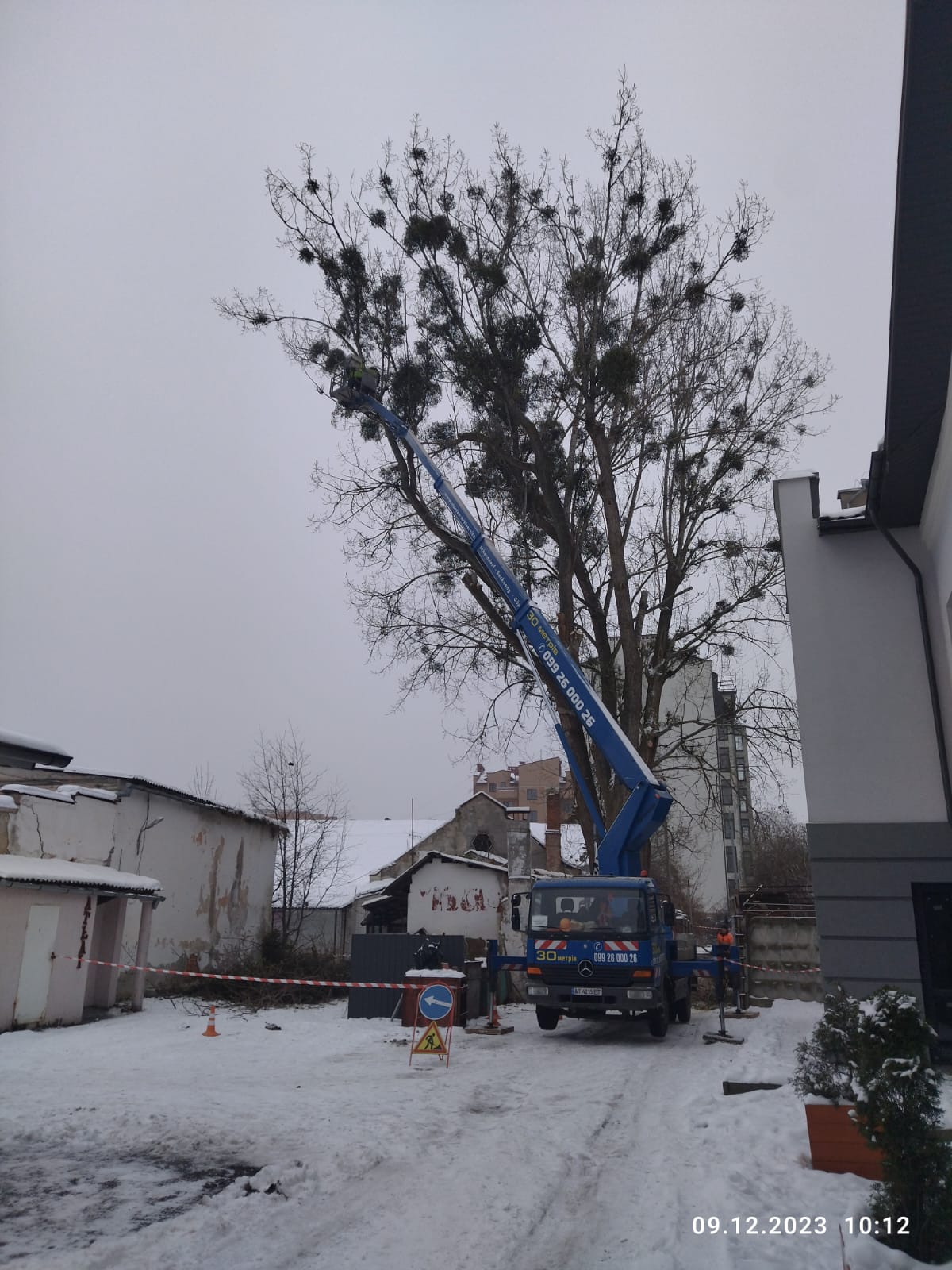 09.12.2023 р. Проводяться роботи з видалення аварійних дерев на вул. Л. Гузара, 9а.