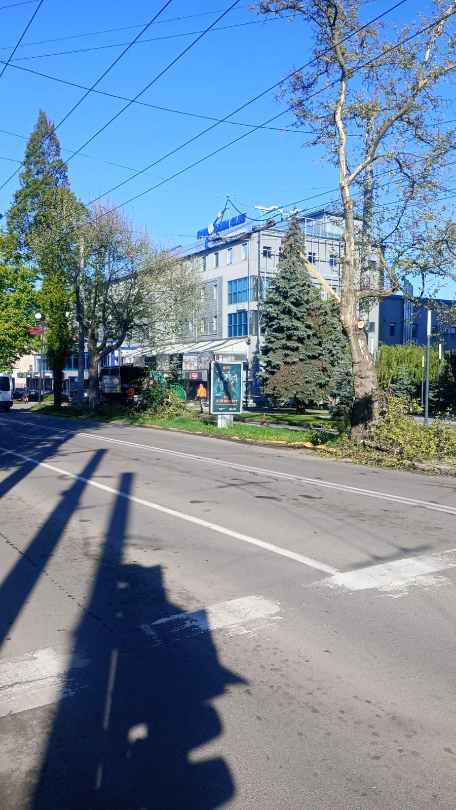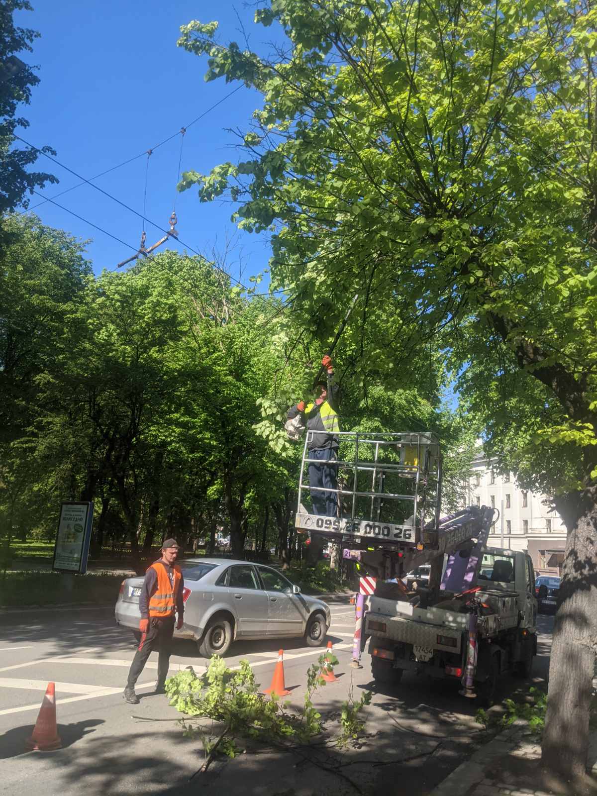 22.04.2024 р. Для забезпечення безпеки руху та належної експлуатації великогабаритного комунального транспорту проводяться роботи з обрізки гілок дерев над знаками та біля контактної мережі тролейбусів.